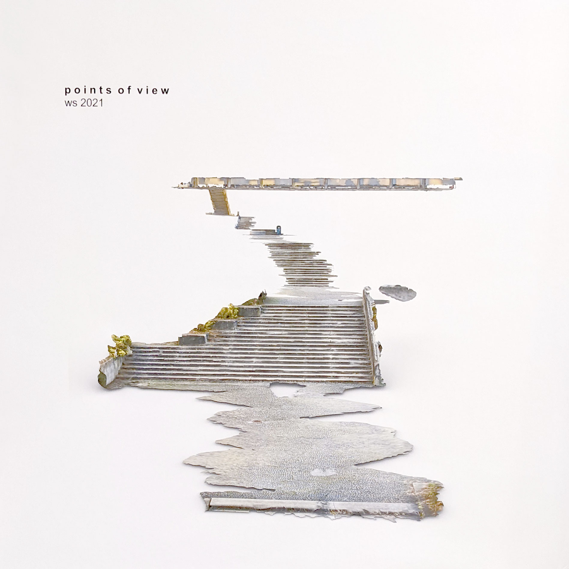 The exhibition „points of view“ shows what this can look like. Prof. Leifeld and Prof. Barlieb let their students fan out onto the campus. They created drone images, LiDAR scans, 3D models, and point clouds, each unique perspective. Actual buildings such as the bridge to the library and refectory of the OTH Regensburg or the Audimax of the University of Regensburg ultimately become wire meshes and sculptures made of clay. With the help of modern technology, the students virtually dissect buildings in virtual space to points, pixels, and coordinates – and reassemble them. What can be marveled at from paper, clay, wire, latex, or 3D printing in the exhibition, sometimes in utterly alienated form, wound up, unwound, stacked, folded, can be seen with one’s own eyes a few meters away in its original state cast in concrete or steel.